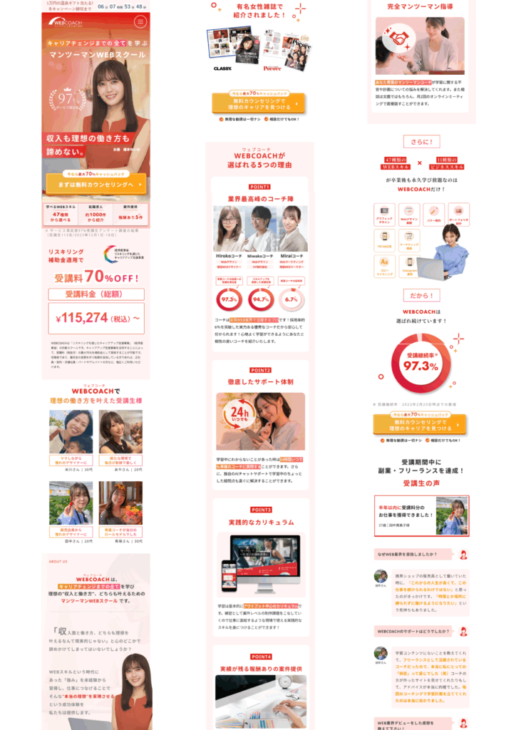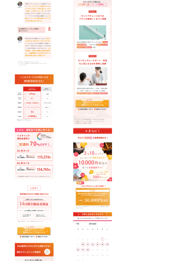ランディングページ制作 2025年8月18日 最終更新日時 : 2025年8月18日 momonga2 【製作時間】20時間【使用ソフト】Photoshop・illustrator・Figma・HTML・CSS・jquery【担当業務】デザイン・実装【意識した亊】スクロール離脱を防ぐためjqueryで動きをつけたLPを作成しました。